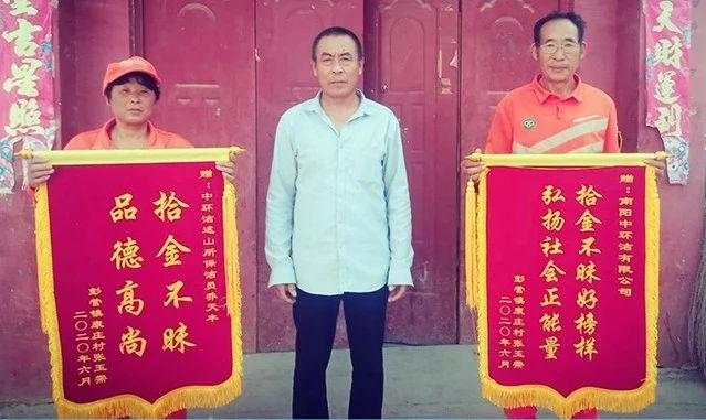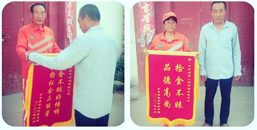 用專業守(shǒu)護環境,用真誠守護美好。近日,鎮(zhèn)平縣遮山鎮的一位村民帶(dài)著兩麵分別印有“拾金不昧,品德高尚”、“拾金不(bú)昧(mèi)好榜樣,弘揚社會(huì)正能量(liàng)”的錦旗(qí)到南陽中環潔遮山掃保所尋找環衛工人喬天豐,要向他及南陽中環(huán)潔公司致謝。